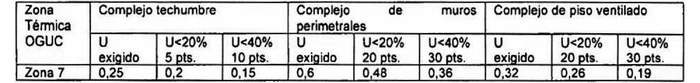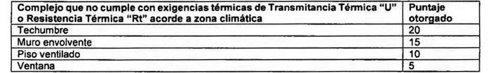 Nota: En caso de mejorar en más de 40% el U exigido para la zona climática correspondiente, el puntaje asignado será el máximo establecido en la tabla, es decir, 10 puntos para complejo techumbre, 30 puntos para complejo muro y 30 puntos para complejo piso ventilado.