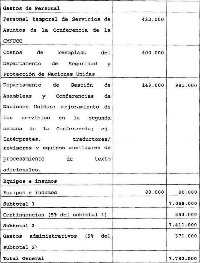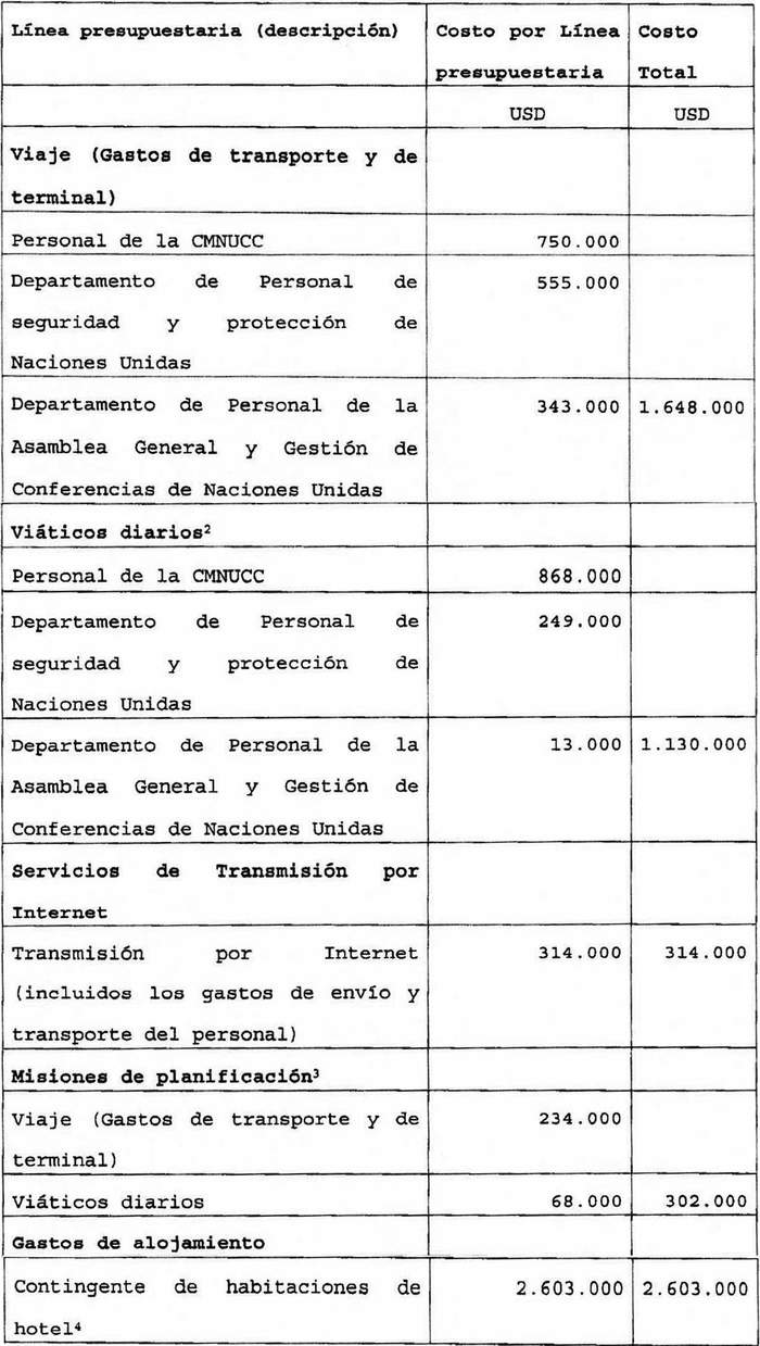 Anexo VI: Costos directos estimados del servicio a la Conferencia fuera de la sede de la secretaría de la CMNUCC. (1)