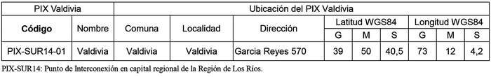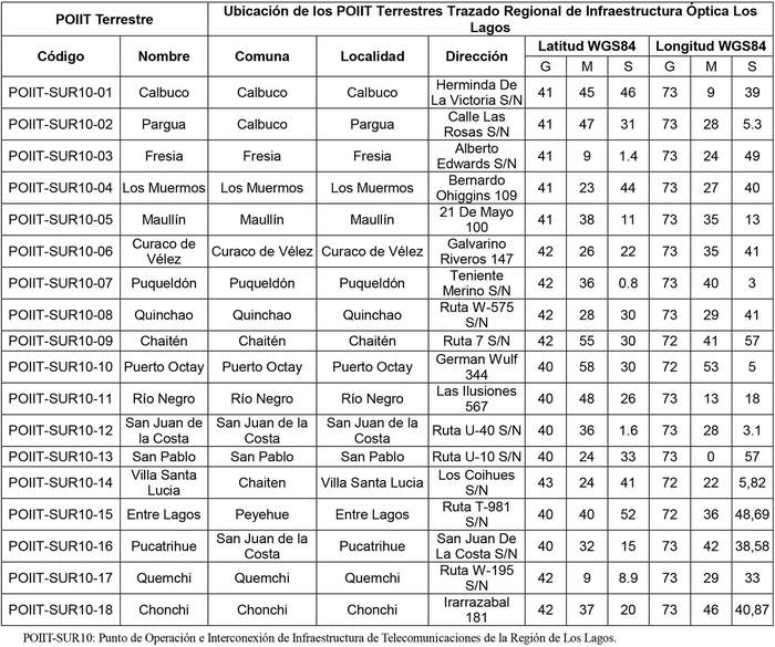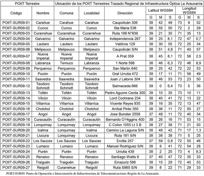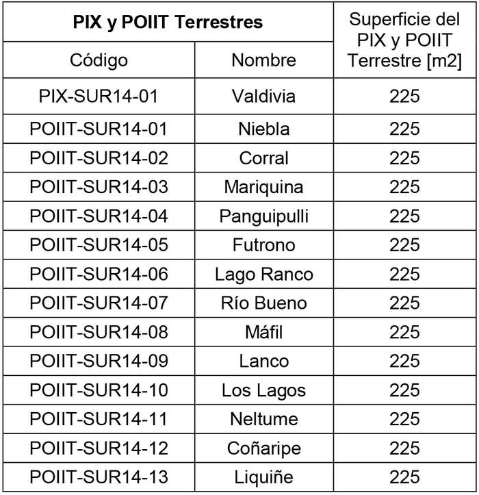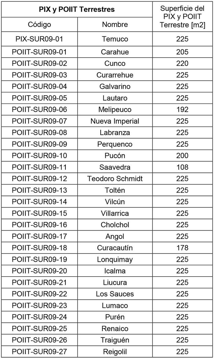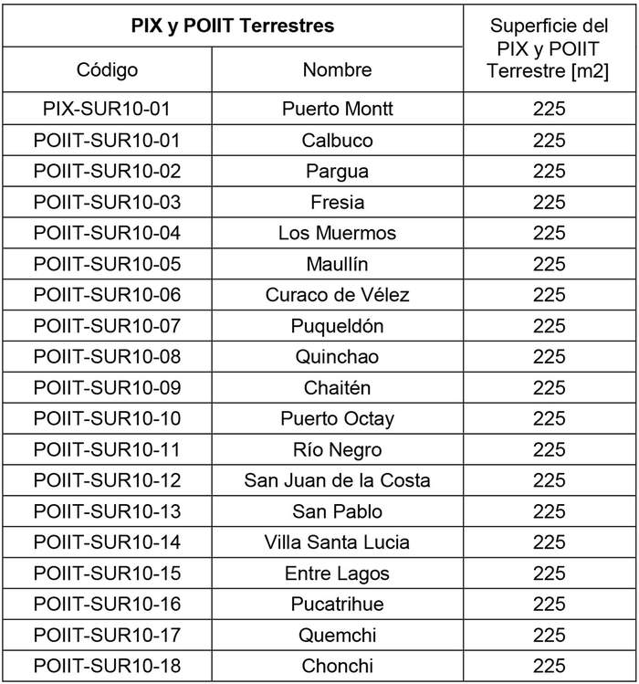 7.2 La Zona de Servicio Mínima corresponde a las áreas de emplazamiento (sitios) y la ubicación de los PIX, Puntos de Derivación y POIIT Terrestres. Por su parte la superficie de los PIX y los POIIT Terrestres de cada Trazado Regional de Infraestructura Óptica de la Macrozona Sur corresponden a los siguientes:
