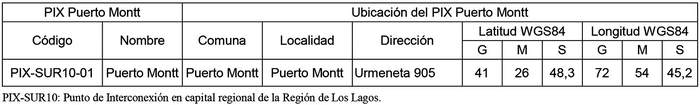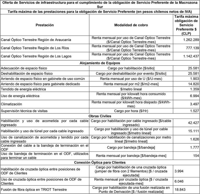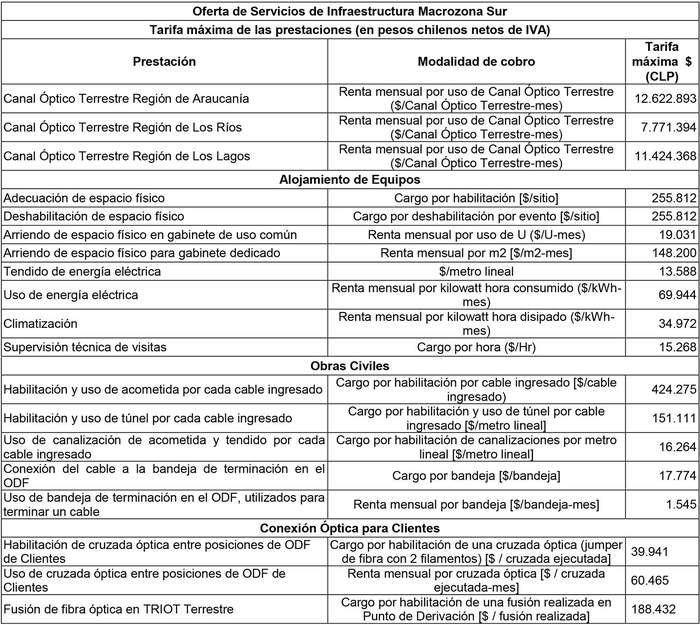 8.2 En cada uno de los PIX, Puntos de Derivación y POIIT Terrestres comprometidos para la Macrozona Sur, se deberá hacer efectiva la Oferta de Servicios de Infraestructura, siendo sus respectivas prestaciones y tarifas máximas las siguientes: