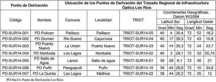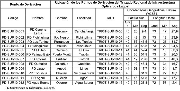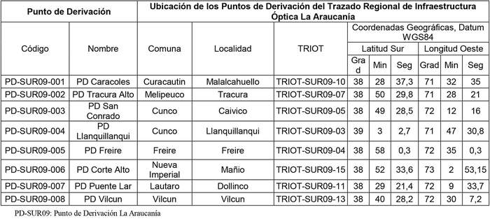6. Ubicación de los Puntos de Derivación de los respectivos Trazados Regionales de Infraestructura Óptica de la Macrozona Sur.