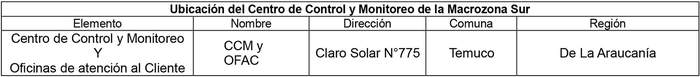 10. El Centro de Control y Monitoreo de la Infraestructura Óptica (NOC) de la Macrozona Sur se encontrará emplazado en el PIX de la ciudad de Temuco, Región de la Araucanía. En dicha locación se instalará y operará el equipamiento necesario para llevar a cabo el control, monitoreo y supervisión centralizados de todos los componentes y elementos que conforman la Macrozona Sur. Se usará el COEOIT junto con los medios propios o de terceros debidamente autorizados que se requieren para el transporte de la información de monitoreo entre los PIX y los POIIT Terrestres de la Macrozona Sur, y el referido Centro de Control y Monitoreo de la Infraestructura Óptica. Asimismo, la concesionaria debe posibilitar el acceso remoto al sistema de monitoreo y supervisión de Macrozona Sur desde la oficina de atención a Clientes que será instalada en la comuna de Temuco, la cual deberá contar con los elementos necesarios para efectuar pruebas y acceder a dicho sistema.