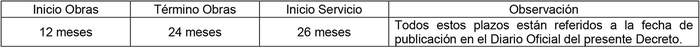 13. Los plazos de inicio y término de obras e inicio de servicio son los que se indican a continuación: