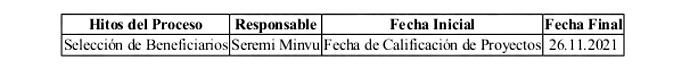4. Que, por resolución exenta N° 219, de fecha 09.07.2021, de la Secretaría Regional Ministerial de Vivienda y Urbanismo Región de Ñuble, se define plazos de procesos y fases de postulación y selección, en el marco del llamado a postulación en condiciones especiales para el Desarrollo de Proyectos del Programa Mejoramiento de Viviendas y Barrios, Capítulo Tercero, proyectos para condominios de viviendas, regulado por el DS N° 27 (V. y U.), de 2016, dispuesto por resolución exenta N° 355 (V. y U.), de fecha 19.03.2021 y sus modificaciones;