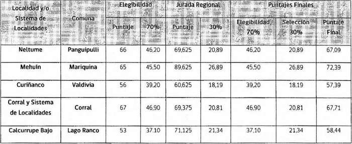 7. Que, las localidades calificadas como elegibles, según lo mencionado en el resuelvo séptimo de la resolución exenta citada en la letra g) de los vistos, modificada por otra individualizada en la letra h) de los vistos, integrarán un listado que será presentado por parte de la Comisión Evaluadora a una Mesa Regional, que evaluará los antecedentes que respalden la localidad propuesta, conforme a los criterios ahí expresados. En este sentido, las evaluaciones realizadas a cada propuesta calificada como elegible constan en las actas individualizadas en los literales bb), cc), dd), ee) y ff) de los vistos.
