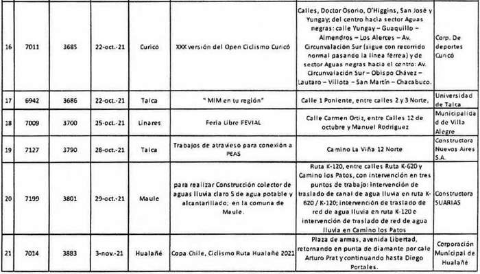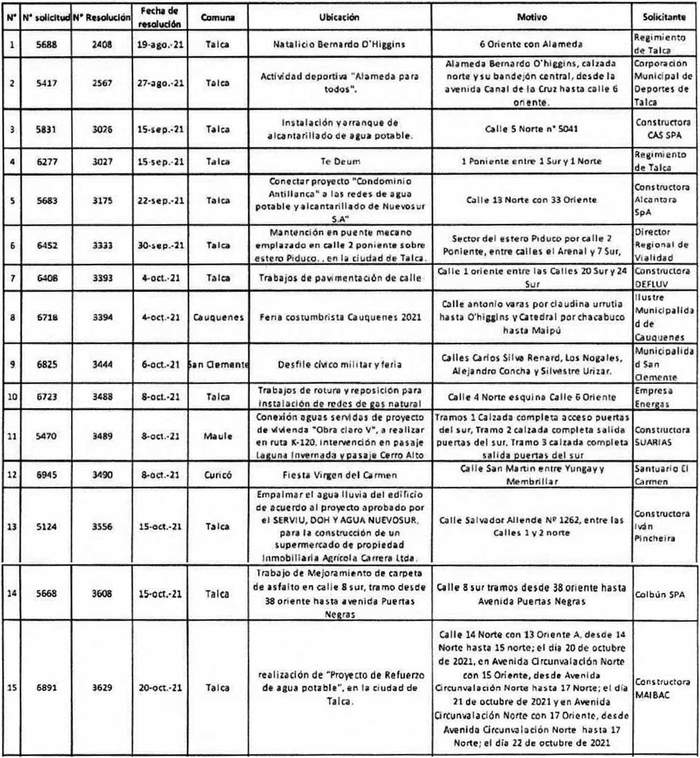 Gobierno Regional del Maule, por resoluciones exentas en las fechas descritas en el siguiente cuadro, prohibió circulación de vehículos por las vías que se indican por los motivos que se señalan a continuación: