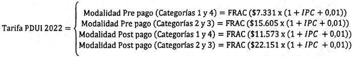 . Si el Pase Diario Único Interoperable como modalidad de post pago se adquiere dentro de los 2 (dos) días siguientes al día de circulación por la vía concesionada, tendrá el mismo valor que un PDUI en modalidad de pre pago. Por lo anterior, su valor será de $7.331 (siete mil trescientos treinta y un pesos) para vehículos livianos (Categorías 1 y 4) y $15.605 (quince mil seiscientos cinco pesos) para vehículos pesados (Categorías 2 y 3). Sin perjuicio del valor señalado en el presente numeral xi., este Pase Diario operará en los términos y condiciones estipulados en el presente decreto supremo para la modalidad de post pago.
