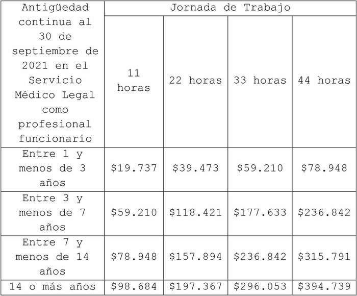 La asignación especial ascenderá a los montos mensuales que se señalan, según la antigüedad y jornada de trabajo que se indican: