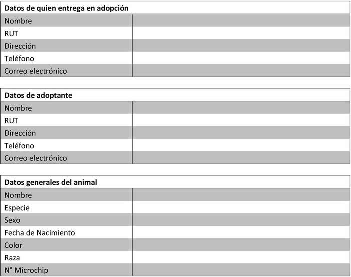 Por medio del presente Contrato de Adopción para Animales de Compañía, las personas que suscriben, es decir quien entrega en adopción y quien adopta, se comprometen a dar cumplimiento a las obligaciones contenidas en el siguiente contrato, sin perjuicio de aquellas establecidas en la Ley 21.020 sobre Tenencia Responsable de Mascotas y Animales de Compañía.