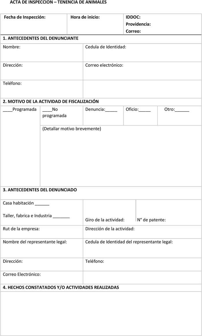 La Dirección de Medio Ambiente, Aseo y Ornato, para facilitar la labor de fiscalización del Inspector Municipal, dispondrá de un documento técnico denominado Acta de inspección-Tenencia de Animales (anexado en esta ordenanza). A requerimiento del Inspector Municipal, toda persona deberá colaborar para el correcto desempeño de su función; el hecho de entrabar o impedir el acceso a los animales o a los lugares que son objeto de fiscalización será puesto en conocimiento del Juez de Policía Local de la comuna de La Granja para que en uso de sus facultades, adopte las medidas, que estime necesarias. Habiendo resolución de juez competente que, en forma, autorice el ingreso al domicilio o lugar de inspección, no será lícito oponer resistencia, pudiendo la autoridad municipal hacer ingreso, incluso, con el auxilio de fuerza pública.