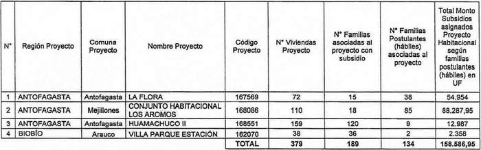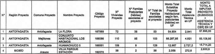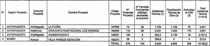 4. Asígnase a los proyectos seleccionados en el Resuelvo 2. de la presente resolución, por concepto de pago por los Servicios de Asistencia Técnica, por las Labores de Fiscalización Técnica de Obra y pago de Aranceles al Conservador de Bienes Raíces, los montos expresados en Unidades de Fomento que se detallan a continuación: