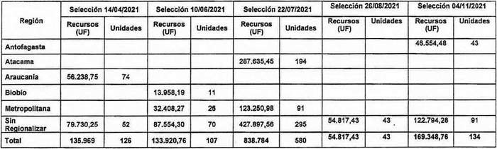 5. Los recursos comprometidos en el Resuelvo 2. y 4. de la presente resolución, para los proyectos seleccionados en el concurso a que se llamó por resolución exenta Nº 325 (V. y U.), de 2021, en el cierre de postulación efectuado el día 4 de noviembre de 2021, se resume en el siguiente cuadro, incluyendo la suma total de familias beneficiadas y Unidades de Fomento comprometidas, considerando los montos de subsidio de los proyectos, incluidos sus respectivos servicios de asistencia técnica y fiscalización técnica de obras: