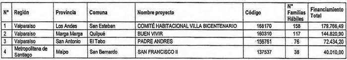 2. Apruébase la nómina de proyectos seleccionados con su respectivo financiamiento total, para el otorgamiento de subsidios del Programa Habitacional Fondo Solidario de Elección de Vivienda en la alternativa de postulación colectiva, para proyectos de Construcción en Nuevos Terrenos, en las Regiones Valparaíso y Metropolitana de Santiago, correspondiente al proceso de selección cuyo cierre de postulación se verificó el día 14 de octubre de 2021, del llamado efectuado por resolución exenta Nº 224 (V. y U.), de 2021: