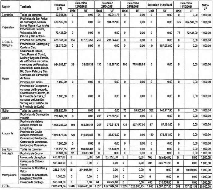 4. Los recursos comprometidos en el resuelvo 2. de la presente resolución, para los proyectos seleccionados en el concurso a que se llamó por resolución exenta Nº 224 (V. y U.), de 2021, cuyo cierre de postulación se efectuó el día 14 de octubre de 2021, y de selecciones ya realizadas, se resumen en el siguiente cuadro para cada región del país, incluyendo la suma total de familias beneficiadas y las Unidades de Fomento comprometidas, considerando los montos de subsidio de los proyectos, incluidos sus respectivos servicios de asistencia técnica y fiscalización técnica de obras: