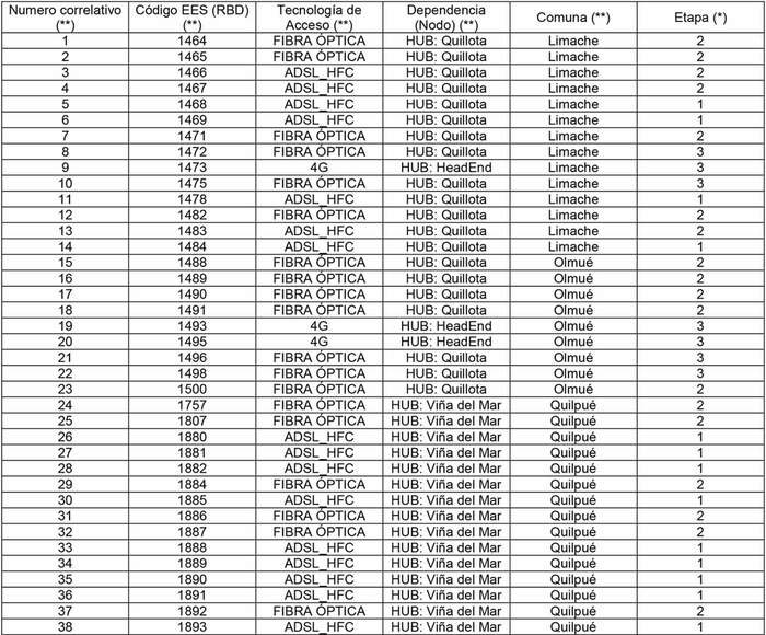 (*) En número de referencia a la Etapa corresponde a la fase en cuyo plazo máximo deberá prestar el Servicio de Conectividad en los EES que pertenecen a la Zona 17 conforme a lo indicado en el resuelvo octavo de la resolución exenta Nº 433, de fecha 01.03.2021, de la Subsecretaría de Telecomunicaciones.