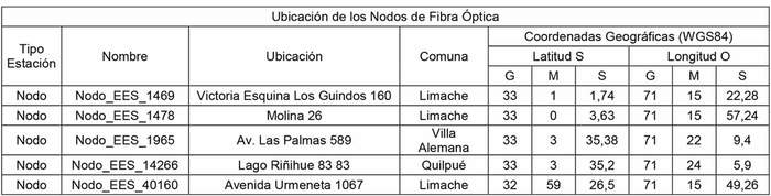 1.2 Instalar, operar y explotar los siguientes Nodos de Fibra Óptica, correspondientes a la red de acceso, según se indica a continuación: