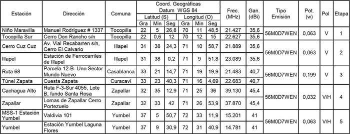 1. Autorízase a la concesionaria para instalar, operar y explotar siete (7) radioenlaces, en las regiones de Antofagasta, Coquimbo, Valparaíso, Biobío y la Araucanía, según se indica a continuación: