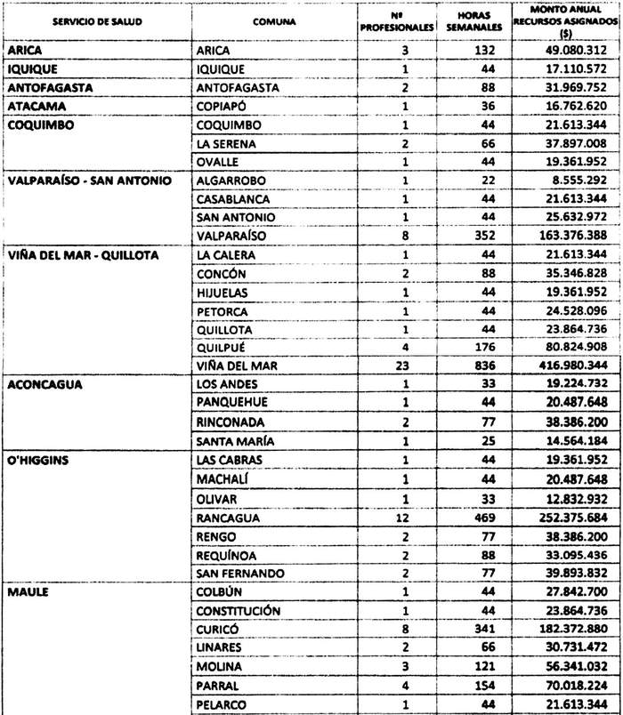 Las entidades administradoras de salud municipal que se indican a continuación, concederán dicha asignación a los médicos cirujanos que cuenten con esta especialidad, para lo que contarán con los siguientes recursos para ello, en atención al número de profesionales y de horas semanales contratadas, conforme lo que a continuación se indica: