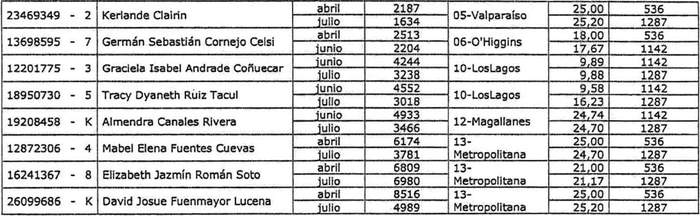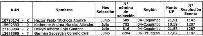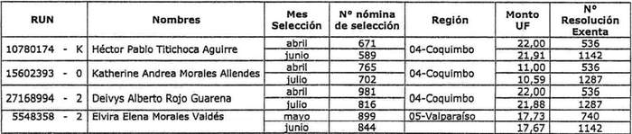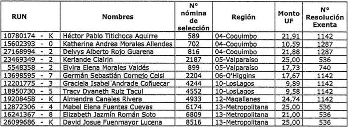 a) Que, por error en la emisión de las nóminas de seleccionados de la plataforma de postulación del llamado dispuesto por la resolución exenta citada en el Visto c), las personas que se indican se incorporaron en dos resoluciones que aprueban nóminas de beneficiarios indicadas en el Visto d):