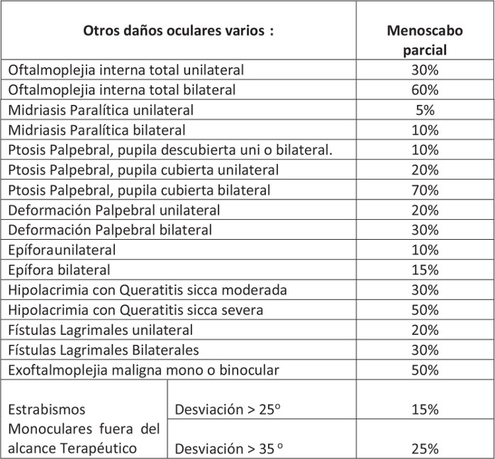 Algunas anormalidades cutáneas como nevos pigmentados, angiomas, hiperpigmentación o despigmentación, vitiligo, las cicatrices cutáneas como resultado de la curación de quemaduras, traumatismos o procesos quirúrgicos extensos que pueden llevar a la desfiguración, producen menoscabo laboral por sí mismas. Su magnitud es determinante en el aislamiento individual o social de quien las padece y comprometerá su capacidad laboral en un 50% o más.