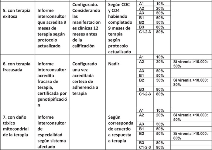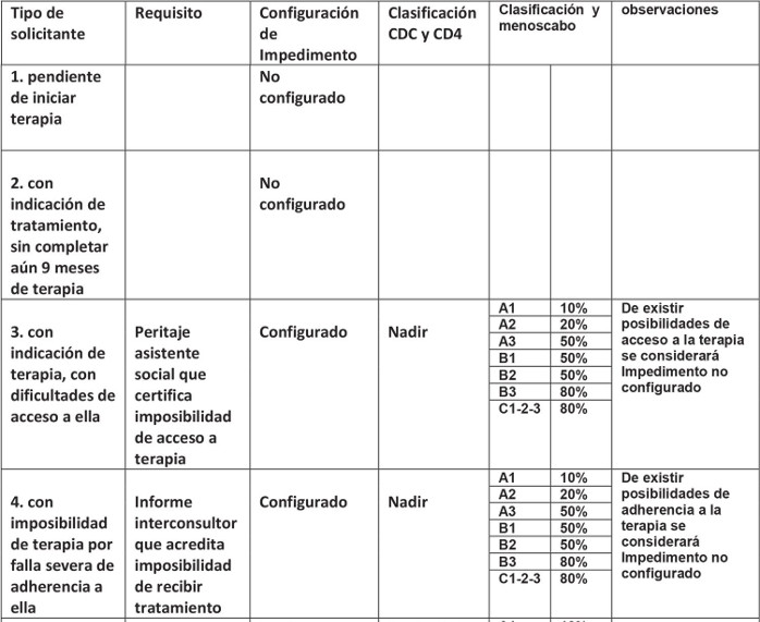 Existiendo posibilidades de acceso a tratamiento a través de Garantías Explícitas de Salud (GES) u otros programas definidos por el Ministerio de Salud, cumplir con sus protocolos terapéuticos se considerará exigencia mínima para configurar, con excepción de las terapias paliativas. No obstante, la Comisión Médica con apoyo de un peritaje socio-laboral podrá considerar configurable alguno de estos impedimentos si hubiera evidencia de incumplimiento, no factible de corregir por parte del evaluado, tales como tratamientos insuficientes o imposibilidad de derivación a terapias más especializadas, aun con la debida adherencia del evaluado.