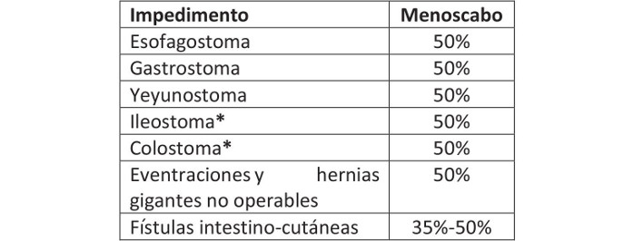 Las secuelas post-operatorias importantes, no específicamente incluidas en la categoría de daños por neoplasia maligna deberán ser evaluadas de acuerdo al sistema orgánico afectado. Una gastrectomía ampliada dependerá de la gastrectomía como tal y sus complicaciones derivadas como dumping, desnutrición. Las colostomías deberán considerarse con el porcentaje de menoscabo correspondiente a una ostomía, y las nefrectomías en el porcentaje otorgado en el capítulo para esta patología.