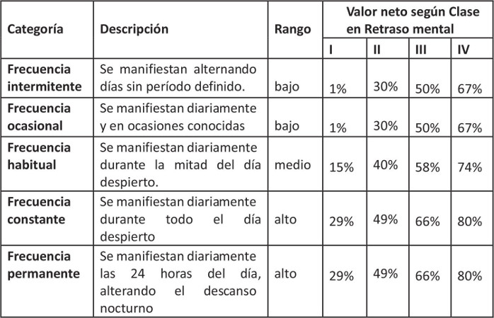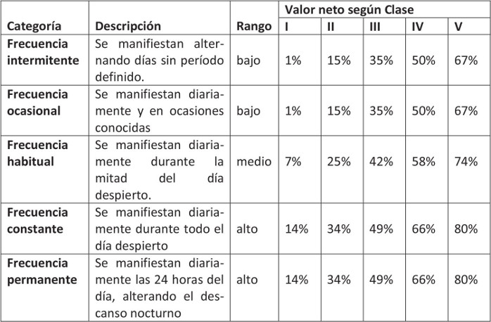 El menoscabo laboral permanente de estos impedimentos está determinado por el nivel de funcionamiento y la capacidad de interacción y adaptación social. El rango al interior de la clase por la frecuencia con que se interfieren las AVD. Dado que los impedimentos en este grupo pueden presentar déficit cognitivo, no se ha de configurar concomitantemente con un Retraso mental para no producir doble ponderación del menoscabo.