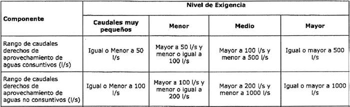 Cuadro N° 1. Niveles de exigencia para las obras de captación de aguas superficiales que se encuentran ubicadas en la Región de Magallanes y de la Antártica Chilena, específicamente en las cuencas "Costeras e Islas entre R Hollemberg, Golfo Alte. Laguna Blanca", "Tierra del Fuego" y "Costeras entre Laguna Blanca (inc), Seno Otway, Canal Jerónimo y Magallanes".