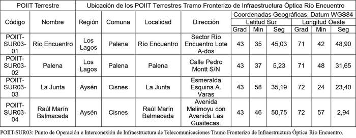 1. Autorízase a la concesionaria para instalar, operar y explotar infraestructura física para telecomunicaciones en las regiones de Los Ríos, de Los Lagos, de Aysén del General Carlos Ibáñez del Campo y de Magallanes y de la Antártica Chilena, correspondiente a los POIIT y TRIOT Terrestres, Puntos de Terminación y Puntos de Derivación para los Tramos Fronterizos de Infraestructura Óptica que se individualizan a continuación, así como los equipos, componentes y elementos que permiten la provisión del Servicio de Infraestructura, con los cuales, además, se deberá cumplir con la obligación de Servicio Preferente, todos ellos objeto del Concurso "Fibra Óptica en Complejos Fronterizos", Código: FDT-2020-01, de acuerdo con lo exigido en las Bases del Concurso y el Proyecto adjudicado, todos indicados en los literales g), h), i), j), k) y l) de los Vistos, respectivamente, y lo solicitado por la concesionaria mediante los ingresos Subtel del literal a) de los Considerando. En específico y para cada uno de los Tramos Fronterizos de Infraestructura Óptica, se autoriza la provisión de ocho (8) Canales Ópticos Terrestres, uno (1) de ellos destinado a la implementación de un Canal Óptico Exclusivo para la Operación de Infraestructura de Telecomunicaciones (COEOIT), en los términos requeridos en las Bases Específicas y lo declarado en el Proyecto correspondiente.