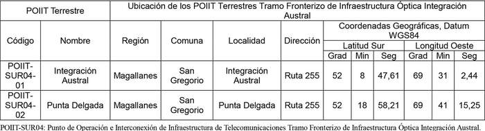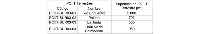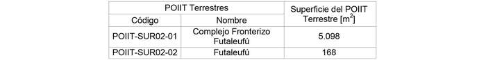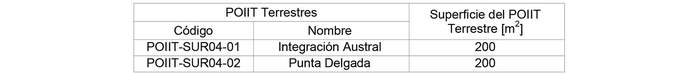 7.2 La Zona de Servicio Mínima corresponde a las áreas de emplazamiento (sitios) y la ubicación de los Puntos de Terminación, Puntos de Derivación y POIIT Terrestres. Por su parte la superficie de los POIIT Terrestres de cada Tramo Fronterizo de Infraestructura Óptica de la Zona Geográfica Sur corresponden a los siguientes: