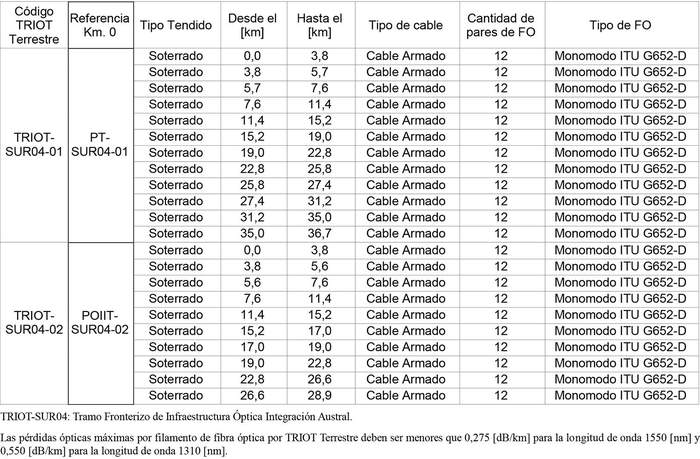 5. Características técnicas de los TRIOT Terrestres de los respectivos Tramos Fronterizos de Infraestructura Óptica del Proyecto Zona Geográfica Sur.