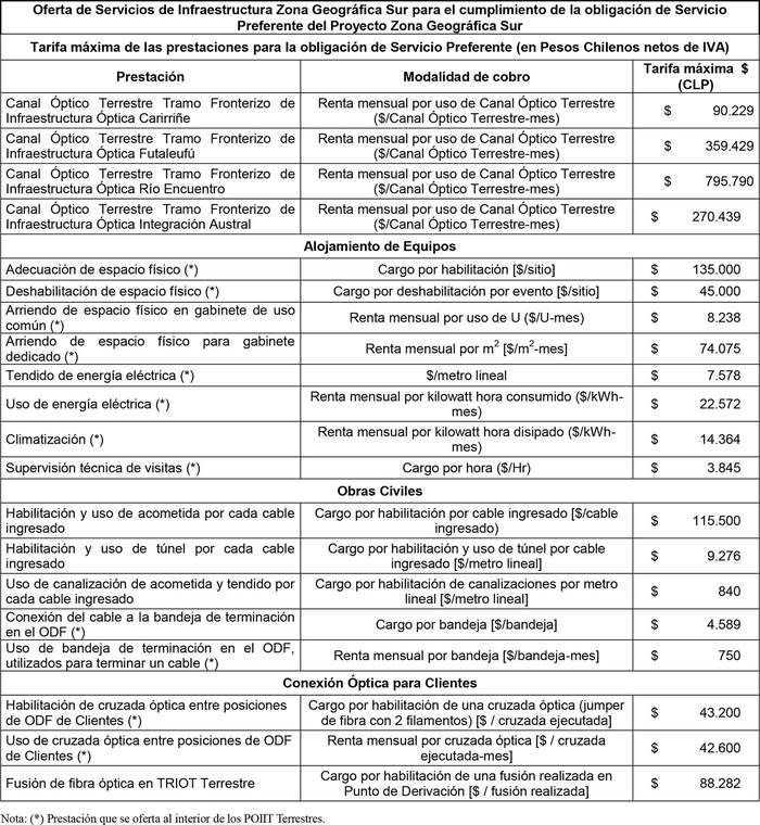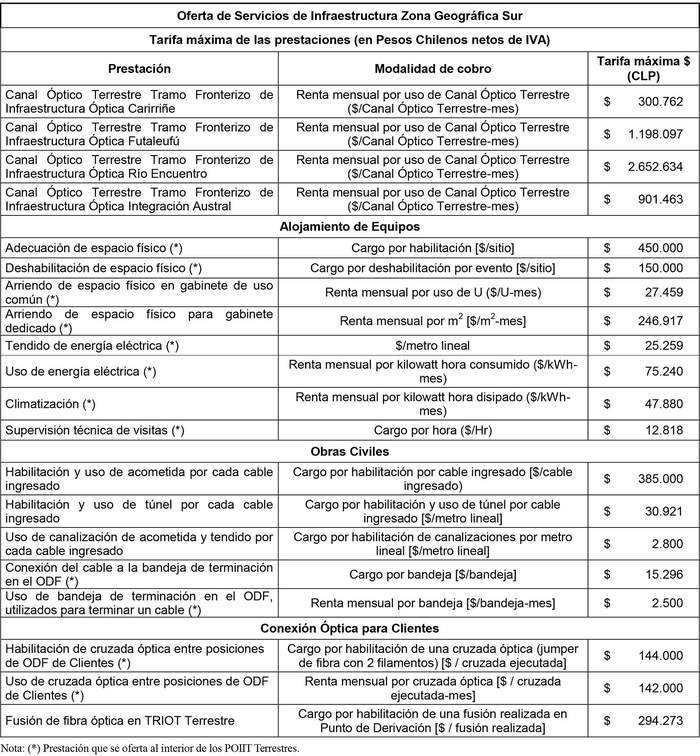 8.2 En cada uno de los Puntos de Terminación, Puntos de Derivación y POIIT Terrestres comprometidos para el Proyecto Zona Geográfica Sur, se deberá hacer efectiva la Oferta de Servicios de Infraestructura, siendo sus respectivas prestaciones y tarifas máximas las siguientes: