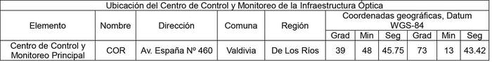 11.1 El Centro de Control y Monitoreo de la Infraestructura Óptica del Proyecto Zona Geográfica Sur se encontrará emplazado en la ciudad de Valdivia, Región de Los Ríos. En dicha locación se instalará y operará el equipamiento y software necesarios para llevar a cabo el control, monitoreo y supervisión centralizados de todos los componentes y elementos que conforman al Proyecto Zona Geográfica Sur. Se utilizará el COEOIT junto con los medios propios o de terceros debidamente autorizados por Subtel que se requieren para el transporte de la información de monitoreo entre los POIIT Terrestres del Proyecto Zona Geográfica Sur y el referido Centro de Control y Monitoreo de la Infraestructura Óptica.