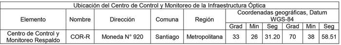 11.2 La ubicación del respaldo del Centro de Control y Monitoreo de la Infraestructura Óptica comprometido se encontrará en la comuna de Santiago, Región Metropolitana de Santiago, según se indica a continuación: