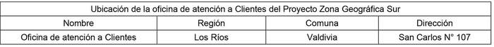 12. La ubicación de la oficina de atención a Clientes del Proyecto Zona Geográfica Sur se encontrará en la comuna de Valdivia, Región de Los Ríos, según se indica a continuación: