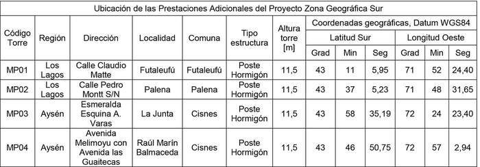 13. La concesionaria deberá implementar las denominadas Prestaciones Adicionales, las cuales deberán estar disponibles al momento del inicio de Servicio de Infraestructura y encontrarse vigentes por todo el Periodo de Obligatoriedad de las Exigencias de las Bases. Dichas Prestaciones Adicionales, conforme lo dispuesto en el artículo 12° y en el numeral 1.8, ambos del Anexo N° 1, ambos de las Bases Específicas del Concurso del literal h) de los Vistos, corresponden a torres soporte de sistemas radiantes, cuyas características técnicas y ubicaciones serán las que se indican a continuación: