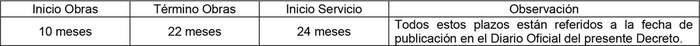 15. Los plazos de inicio y término de obras e inicio de servicio son los que se indican a continuación: