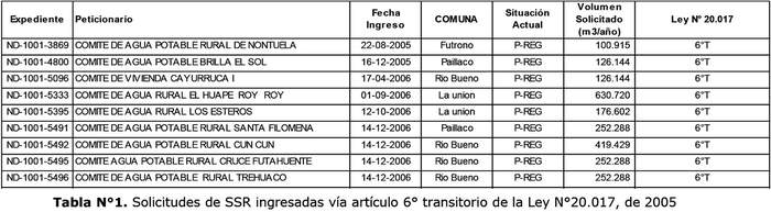 11. Que, en relación a éstas, el Informe destaca 9 solicitudes ingresadas bajo la vía del artículo 6° transitorio de la ley N°20.017, de 2005, que figuran pendientes, cuyos volúmenes y caudales, de acuerdo a la letra a) del artículo 54 del decreto supremo N°203, del Ministerio de Obras Públicas, de 2013, han sido contemplados en la cuantificación de la demanda comprometida del SHAC, al ser derechos susceptibles de ser constituidos al alero de la Ley N°20.017. La siguiente Tabla señala detalla la situación de estas solicitudes, el caudal y volumen solicitado:
