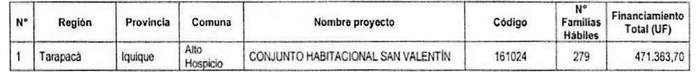 2. Apruébase el siguiente proyecto seleccionado con su respectivo financiamiento total, para el otorgamiento de subsidios del Programa Habitacional Fondo Solidario de Elección de Vivienda en la alternativa de postulación colectiva, para proyectos de Construcción en Nuevos Terrenos, en la Región de Tarapacá, correspondiente al proceso de selección cuyo cierre de postulación se verificó el día 30 de noviembre de 2021, del llamado efectuado por la resolución exenta N° 352 (V. y U.), de 2021:
