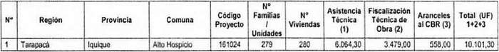 3. El monto del subsidio asignado de conformidad con el cuadro señalado en el Resuelvo 2. de esta resolución comprende los siguientes valores, en Unidades de Fomento, por concepto de Servicios de Asistencia Técnica, de Labores de Fiscalización Técnica de Obra y pago de Aranceles al Conservador de Bienes Raíces: