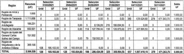 4. Los recursos comprometidos en el resuelvo 2. de la presente resolución, para el proyecto seleccionado en el llamado realizado mediante la resolución exenta N° 352 (V. y U.), de 2021, cuyo cierre de postulación se efectuó el día 30 de noviembre de 2021, se señalan en el siguiente cuadro, incluyendo la suma total de familias beneficiadas y las Unidades de Fomento comprometidas, considerando los montos de subsidio de los proyectos, incluidos sus respectivos Servicios de Asistencia Técnica y Fiscalización Técnica de Obras para cada región del país: