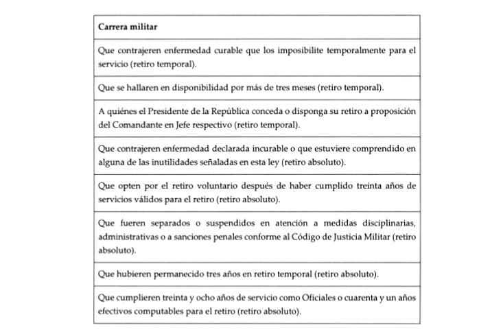 La Ley Orgánica Constitucional de las Fuerzas Armadas Nº 18.948, de 1990, en su Título IV aborda el término de la carrera profesional. Su artículo 54 enumera las causales de retiro absoluto de los oficiales de las Fuerzas Armadas, que implica el cese absoluto del trabajo, como es el caso de los requirentes, y son las siguientes: enfermedad incurable o inutilidad, retiro voluntario, aplicación de medida disciplinaria expulsiva, permanecer más de 3 años en retiro temporal, cumplir 38 años de servicio como oficiales o 41 computables para el retiro y eliminación por calificaciones.