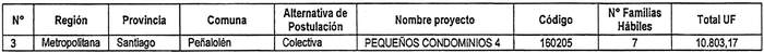 c. Reemplázase en la tabla de pequeños condominios, inserta en su Anexo Único, en su fila Nº 3, correspondiente a la Región Metropolitana, proyecto Pequeños Condominios 4, código 160205, los siguientes montos, según las columnas que se identifican a continuación: