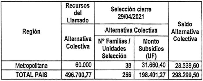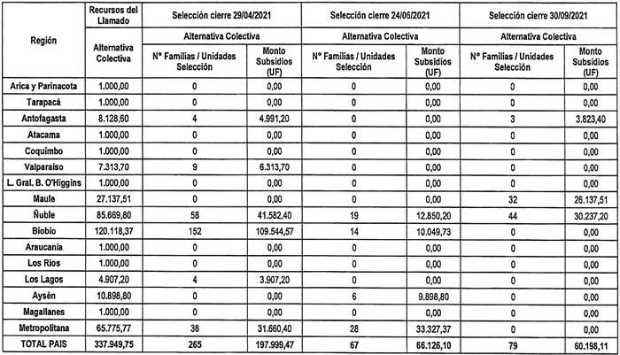 6. Los recursos comprometidos en los resuelvos 4. y 5. de la presente resolución, para los proyectos seleccionados en el concurso que se llamó por resolución exenta Nº 446 (V. y U.), de 2021, cuyo cierre de postulación se efectuó el día 15 de diciembre de 2021, se resumen en el siguiente cuadro para cada región del país, incluyendo la suma total de familias beneficiadas y Unidades de Fomento comprometidas, considerando los montos de subsidio de los proyectos, incluidos sus respectivos servicios de asistencia técnica y fiscalización técnica de obras, según alternativa de postulación. El presente detalle, considera a todas las regiones convocadas en el Llamado con las respectivas selecciones efectuadas, para efectos de cuadratura y cierre del proceso.