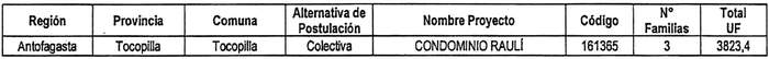 c. Reemplázase en la tabla de pequeños condominios, inserta en su Anexo Único, en su fila Nº 1, correspondiente a la Región de Antofagasta, proyecto Condominio Raulí, código 161365, los siguientes montos, según las columnas que se identifican a continuación: