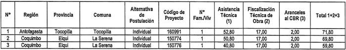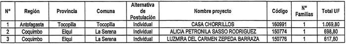 4. Apruébase la siguiente nómina de proyectos seleccionados para el otorgamiento de subsidios del Programa Habitacional Fondo Solidario de Elección de Vivienda, con su respectivo financiamiento total, incluyendo los servicios de asistencia técnica y fiscalización técnica de obras, correspondientes a: 3 proyectos en la modalidad de Construcción en Sitio Propio, todos postulados de manera individual en las regiones de Antofagasta y Coquimbo, correspondiente al proceso de selección cuyo cierre de postulación se efectuó el día 15 de diciembre de 2021, en el llamado efectuado por resolución exenta Nº 446 (V. y U.), de 2021: