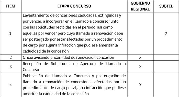 6) Que, en relación al anterior proceso, cabe recordar que, conforme a la normativa citada, el Ministerio de Transportes y Telecomunicaciones -y, a partir, de la concreción de la transferencia de competencias, los gobiernos regionales-, durante el primer mes de cada cuatrimestre calendario, deberá llamar a concurso por todas las concesiones que se le hubiesen solicitado y por aquellas cuya caducidad se hubiese declarado y aquellas concesiones cuyas extinciones se hubieren certificado, durante el periodo que medie entre uno y otro concurso. Con posterioridad, la Subsecretaría excluirá del llamado aquellas frecuencias que, por resolución técnicamente fundada, declare no estar disponibles. Además, se debe llamar a concurso con no menos de 180 días de anterioridad al vencimiento del plazo de vigencia de una concesión de radiodifusión. Las concesiones serán asignadas al postulante cuyo proyecto asegure una óptima transmisión, excelente servicio y el debido cumplimiento de los fines informativos, comunitarios, sociales o culturales, para el que se solicitó la concesión, evaluación que según el decreto supremo Nº 71, de 2019, se mantuvo bajo la competencia de la Subsecretaría.