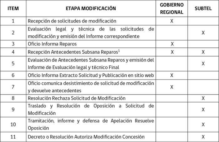 Artículo 3: En el caso de la competencia prevista en el numeral 6 del decreto supremo Nº 71, de 2019, del Ministerio del Interior y Seguridad Pública, consistente en "Recibir y tramitar hasta la etapa de publicación de su extracto, las modificaciones de las concesiones de radiodifusión comunitaria ciudadana, en su región", en la siguiente tabla se consignan las funciones específicas que desarrollarán en dicho proceso los gobiernos regionales y el Ministerio de Transportes y Telecomunicaciones, a través de su Subsecretaría de Telecomunicaciones, según corresponda:
