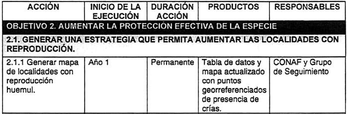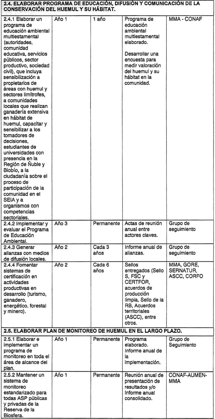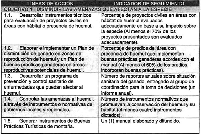 a) Disminuir las amenazas que afectan a la especie: esto está relacionado con reducir la frecuencia y superficie de hábitat de huemul afectada por incendios forestales y por prácticas inadecuadas de manejo de bosque; reducir la interacción directa del ganado doméstico con el huemul, con énfasis, en zonas con reproducción del huemul; evitar la potencial caza ilegal sobre huemul; mejorar y regular el turismo de montaña; aumentar los niveles de información de enfermedades que pueden afectar al huemul para un mejor control sanitario; incorporar medidas ambientales para huemul en todos los proyectos civiles y de urbanización que puedan afectar a la especie; y, finalmente comprometer a los propietarios y a la comunidad local en la protección del hábitat del huemul.