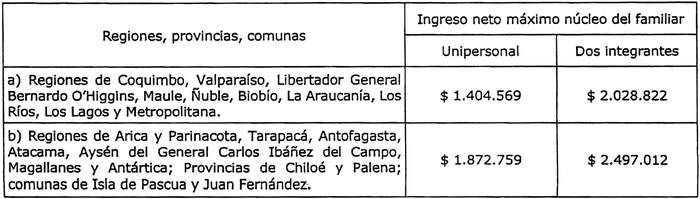 Si el núcleo familiar declarado excede de dos, por cada integrante adicional el ingreso neto se incrementará en $249.701. Para efectos de calcular el límite máximo de ingresos netos, se considerarán hasta dos integrantes adicionales.